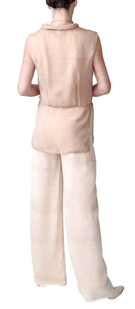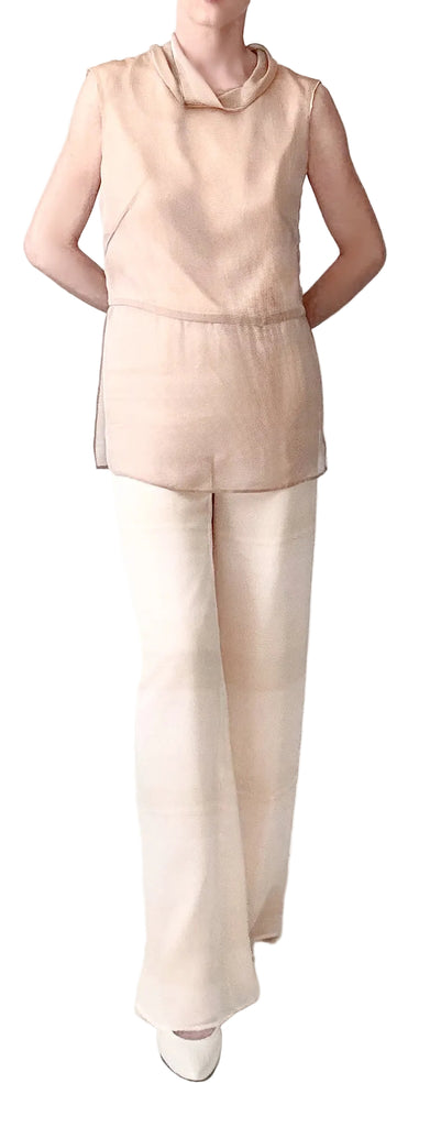 Airy layers of iridescent silk chiffon and silk habotai in pearl float on the body and form flattering effects. The design is focused on the space in between the fabric and the body where comfort rests. The silhouette is shaped thoughtfully with soft hidden construction details. Draped bias chiffon neckline and mother of pearl side button closure finish this dreamy style.
