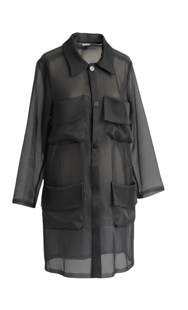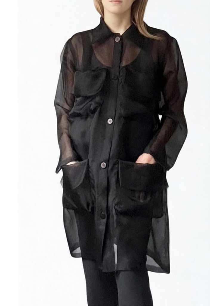 Double layers of 100 % Silk organza create an illusionary effect. The thoughtful construction encloses each seam to finish inside of the layers blurring the transparency of the silk. The fabric maintains a polished silhouette and is breathable natural silk works with the temperature of the body. Flattering and easy to wear casually or to an event.