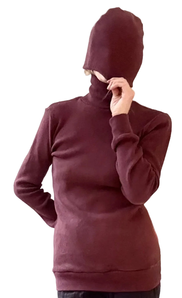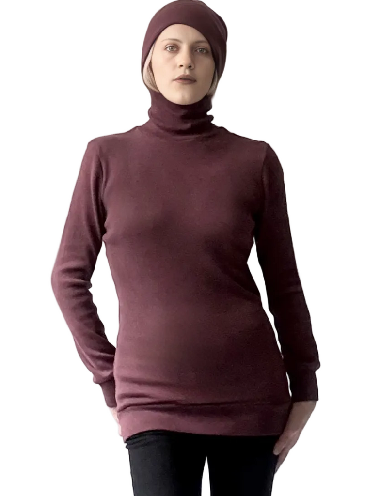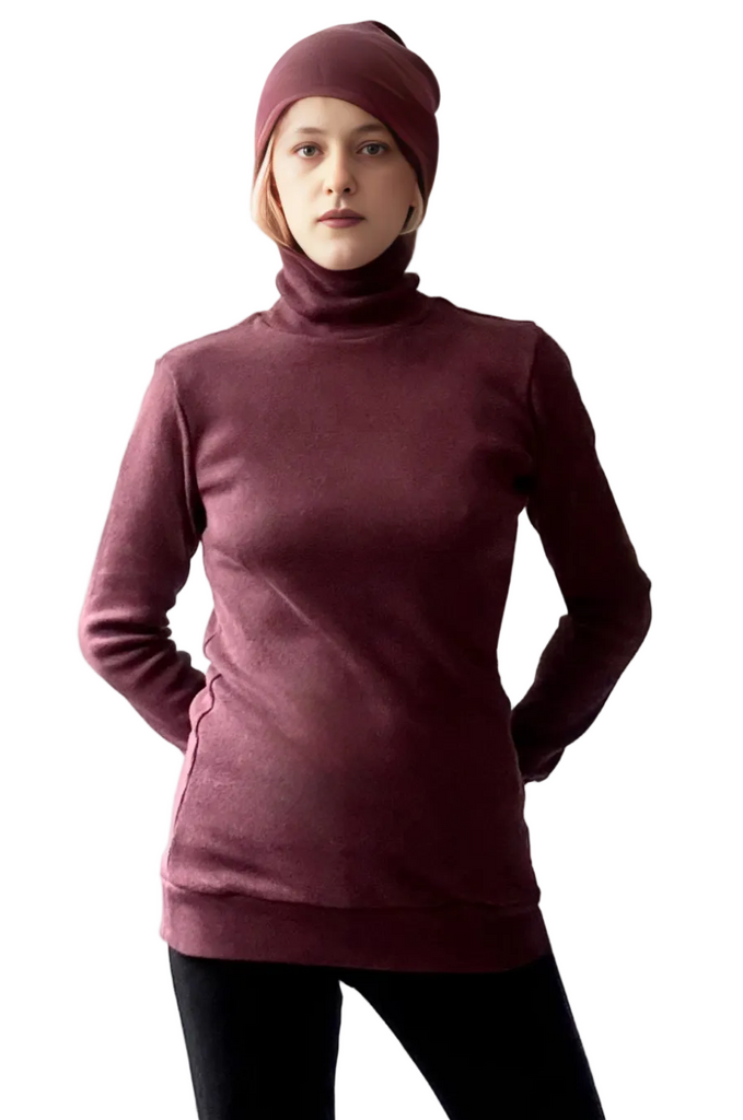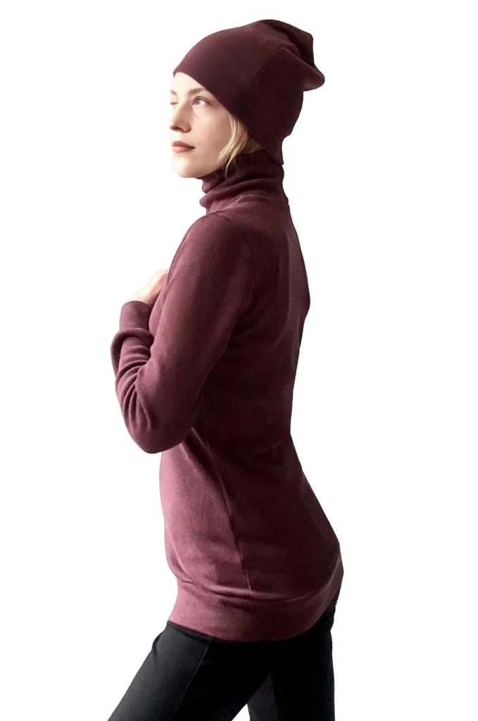 STINSON SWEATER/BEANIE SET in AMARANTH . Comfy and naturally breathable cotton ribbed knit turtleneck sweater and deep cut beanie sold as a set. Duck out from the elements in style.