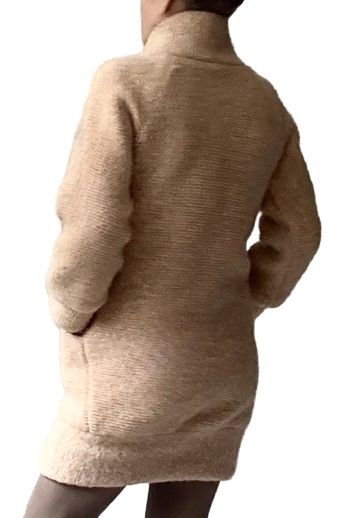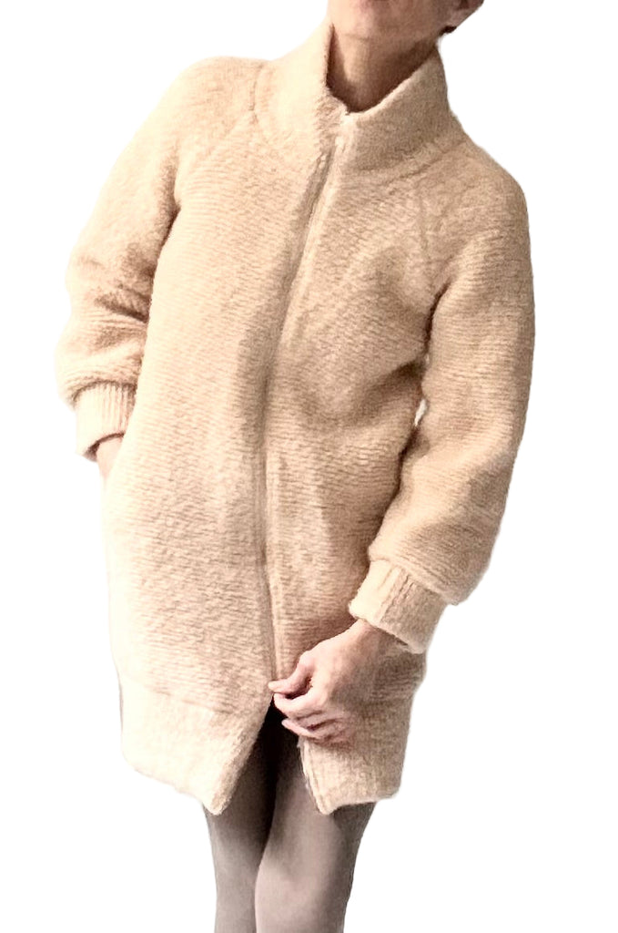 DREAM coat in airy Mohair with silk knit lining (Angel Food). The name says it all about this luxurious piece. In palest beige with a soft Angel Food pink hue. The airy warmth of the mohair coupled with the soft silk jersey lining are a pure pleasure to wear. Front zipper closure and side pockets.